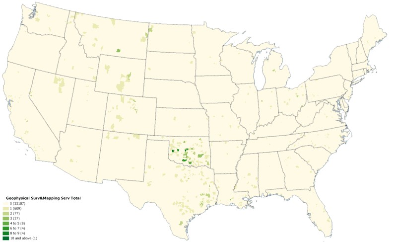 Of course geophysics companies are not that common, so most of the map is white (zero companies). But what is happening in Oklahoma!? When we think of geophysics we might think of California (earthquakes) or Houston (seismic exploration for the oil industry). Well, Oklahoma is seeing a mini oil&gas boom, but so are other places such as the Bakken Formation (Montana / North Dakota). Also, where is Houston?