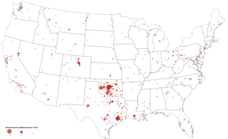 I plotted a map using the sub-total of the Geophysics category – an industry I used to work in. Here is the result: