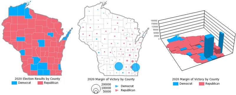 These maps demonstrate a common problem of choropleth maps. This problem of large areas tending to visually dominate small areas is very common in election maps, and is especially noticeable in the US with its two party system. Recent national US elections have never varied more than a few percent between the Democratic and Republican parties. However, Democratic votes tend to be concentrated in urban areas (small areas with high populations), and Republican votes tend to be concentrated in rural areas (large areas of low population). The result is a choropleth map that is very red (Republican) when in reality the votes are pretty evenly balanced.