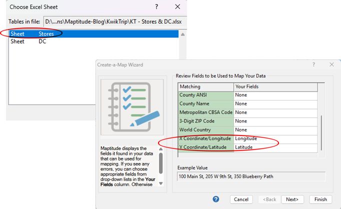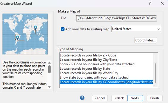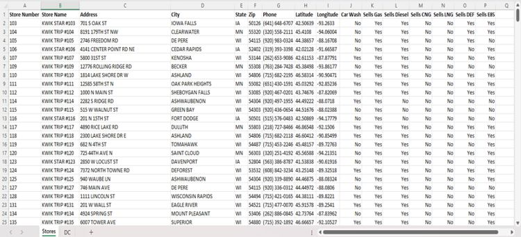 Store location data for this analysis comes directly from the Kwik Trip/Kwik Star website. Alternatively, you can import business location data from the Maptitude built-in layers or create a spreadsheet manually using addresses from Google Maps or similar sources.