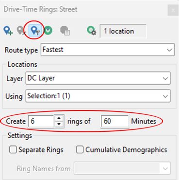 Drive-time rings show how far a vehicle can travel from a starting point within specific time intervals, accounting for road networks and realistic travel speeds. For distribution planning, this helps determine which stores a DC can efficiently serve while complying with federal regulations on driver hours.