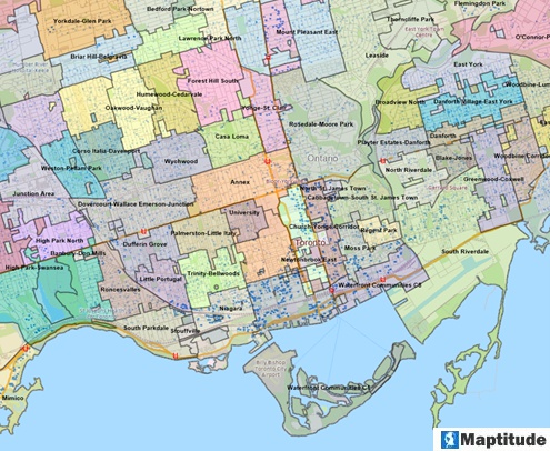 The following map depicts housing transactions in the greater Toronto area. I am interested in aggregating the disaggregate data into districts or communities. My data set has a variable that identifies the community to which each transaction belongs. However, I do not have the territory map.
