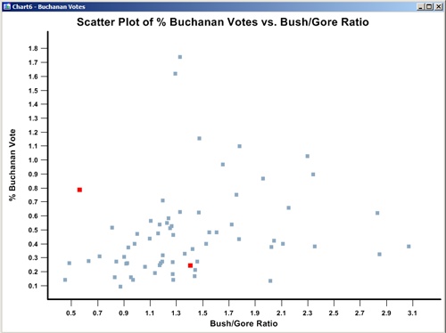 Scatter plot of county Buchanan Votes vs Political Leaning (ie. Bush/Gore ratio). Counties using the 2 column Votomatic machines are in red. Palm Beach is the red square on the left, Duval is in the right of the main cluster.