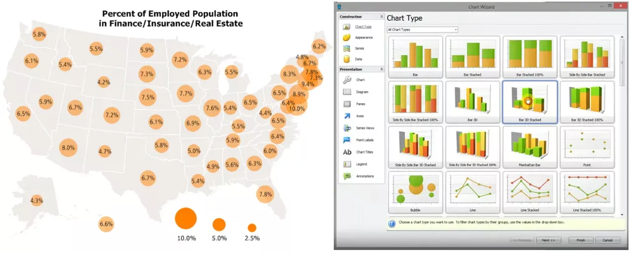 • Create 3-D maps, heat maps, territories, drive-time rings, hot-spots, charts, and reports