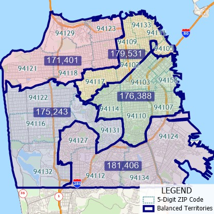 Group together ZIP Codes to make ZIP Code territories that are balanced by sales, customers, population, or other values.