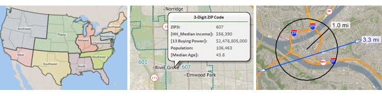 The US Census boundaries (e.g., Tracts, Counties, MCDs, MSAs, States) and the 3- and 5-digit ZIP code areas that come with Maptitude contain some or all of several demographic profiles from a variety of data providers. These sources include the 2010 Census and the 2014 ACS Census to name a few. These data are available for the USA, Puerto Rico, and the Territories. The ZIP Code, Tract, County, and State layers also include updated buying power (disposable income) figures. Tracts also list updated banking compliance FFIEC data for 2015. The Map Librarian makes it easy to access a series of pre-defined thematic and shaded maps of these data.