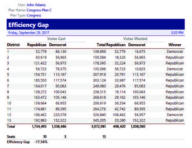 We have added a new Efficiency Gap report which measures partisan symmetry (partisan data not included).