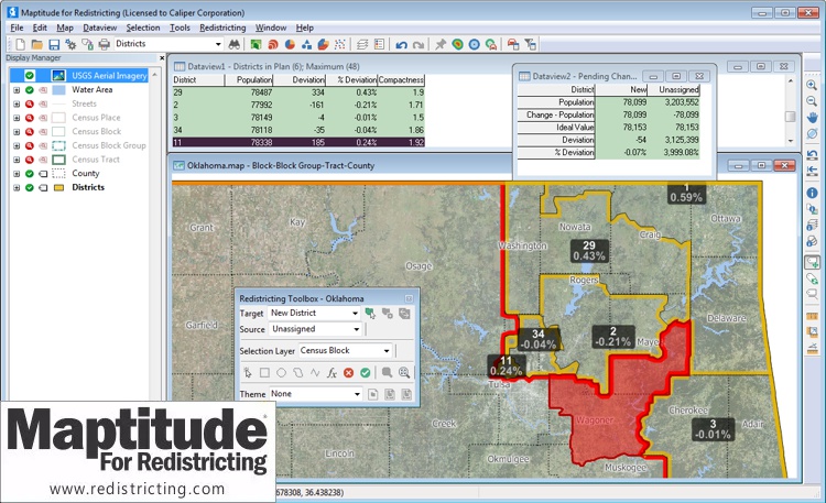NEWTON, MASSACHUSETTS (USA) - Caliper Corporation is pleased to announce that the Oklahoma Senate has selected Maptitude for Redistricting for all of its redistricting activities this decade. We welcome the Oklahoma Senate to our large community of satisfied clients that includes a super-majority of the state legislatures, both major political parties, state parties, public interest groups, cities, and counties. For a partial list of our clients, go to the clients page on our website.