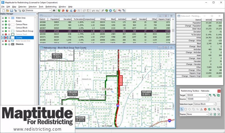 NEWTON, MA (USA) - Caliper Corporation is pleased to announce that the Nebraska Legislature has selected Maptitude for Redistricting for all of its redistricting activities this decade. In addition to the Nebraska Legislature, Logan County CO, DeSoto County MS, Rock Hill SC, and Long Beach CA have also selected Maptitude for Redistricting. We welcome these new clients to our large community of satisfied clients that includes a super-majority of the state legislatures, both major political parties, state parties, public interest groups, cities, and counties. For a partial list of our clients, go to the clients page on our website.